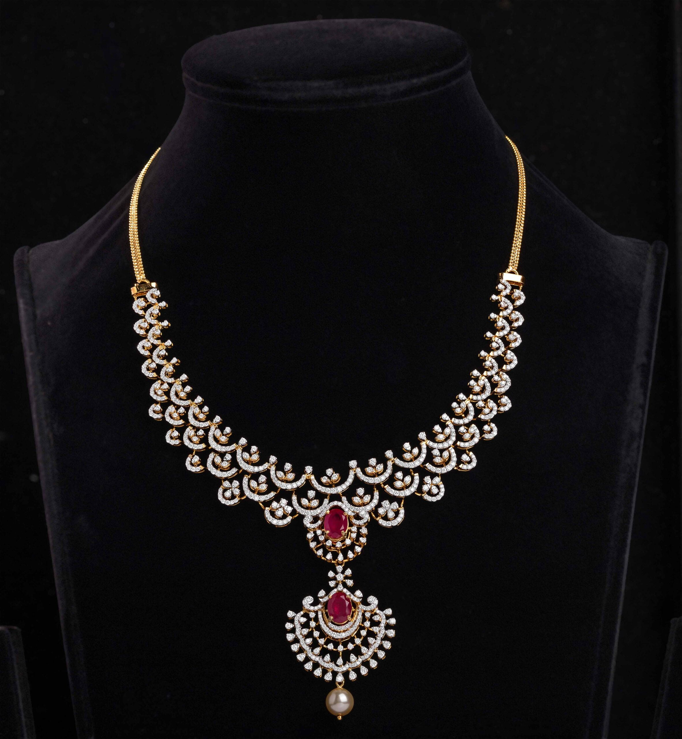 Traditional Ruby Necklace design of elegant artistry with tri petal embellishment and radiant versatility necklace.