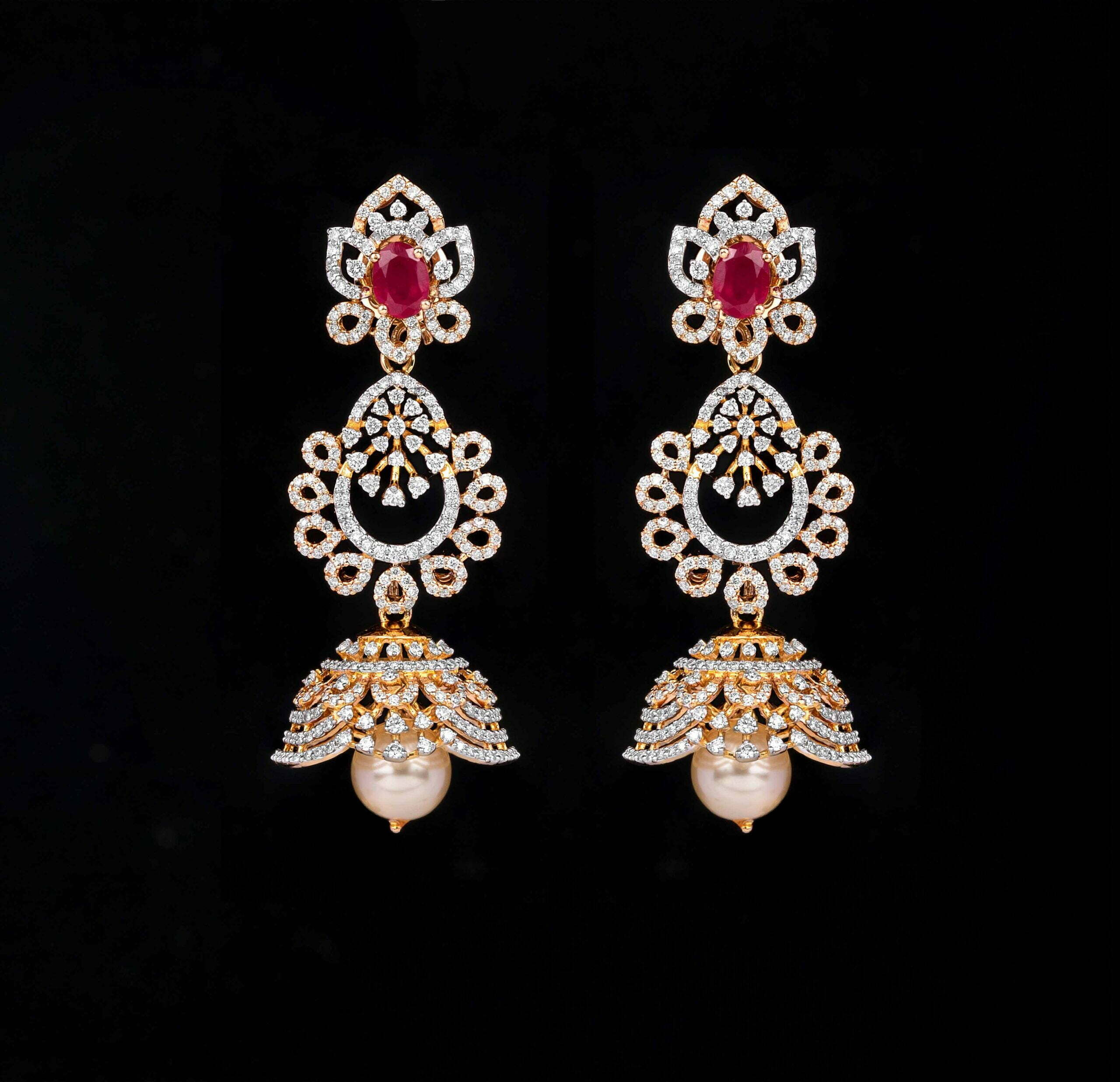 Check our latest crafted small diamond jhumkas embedded with ruby gem stones which makes this Diamond jhumkas classy & Elegant.